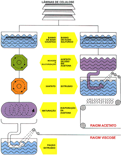O primeiro esquema é sobre as fibras artificias acetato e viscose, obtidas a partir da celulose.