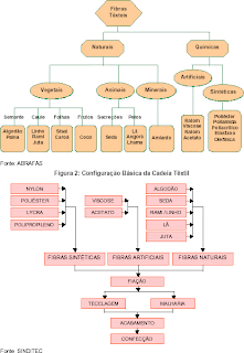 2)Fibras químicas: estão subdivididas em Fibras Artificiais e Fibras Sintéticas.Como a próprio nome já diz, estas fibras sofrem reações químicas para que possam ser utilizadas nos processos seguintes.A complexidade destas reações varia conforme o subgrupo.As fibras artificiais tem como sua principal matéria prima a celulose.De acordo com o tipo de fibra que se quer obter no final do processo(acetato, modal, tecel,viscose), a celulose passa por vários banhos químicos que vão dando, de acordo com a sua aplicação final, as características desejadas.Já as fibras sintéticas são totalmente feitas(ou sintetizadas) a partir do petróleo(nafta).As fibras mais conhecidas deste grupo são o Poliéster, a poliamida(ou NYLON), o Acrílico e o Polipropileno.