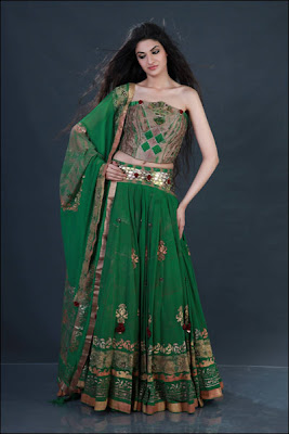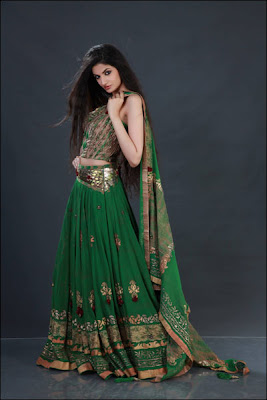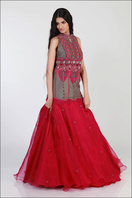 Encompassing a range of gowns, lehengas, tunics her collection is available in ultra vibrant colors including pink, red, green, pearl blue color palettes. The designs of her new collection cater to a very distinct persona & the styles are for a self determining individual who is modern, chick & loves fashion. Fabrics like jersey, organza, dupion, crushed satins etc have been used generously to make her collection all the more appealing.