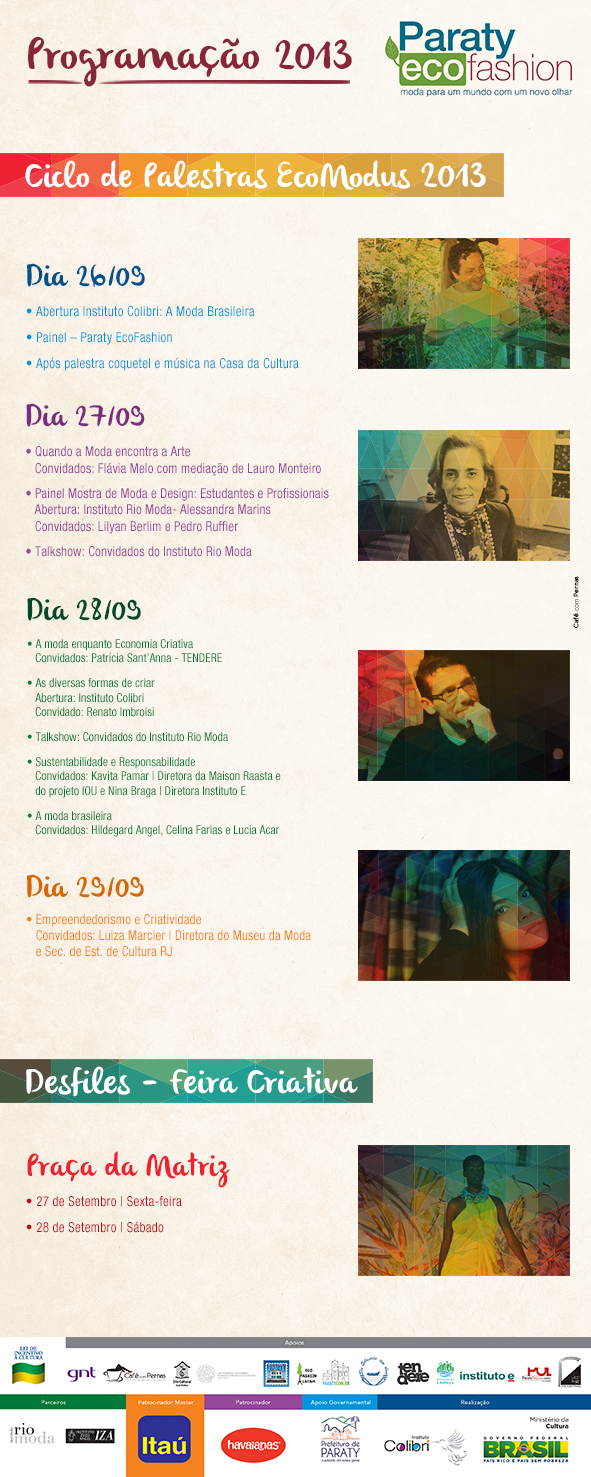De 26 a 29 de setembro, Paraty vai respirar moda e sustentabilidade. O Paraty EcoFashion 2013 vai trazer uma programação rica de palestras e oficinas, desfiles e feira, com os mais renomados profissionais, com garantia de não se perder a viagem.